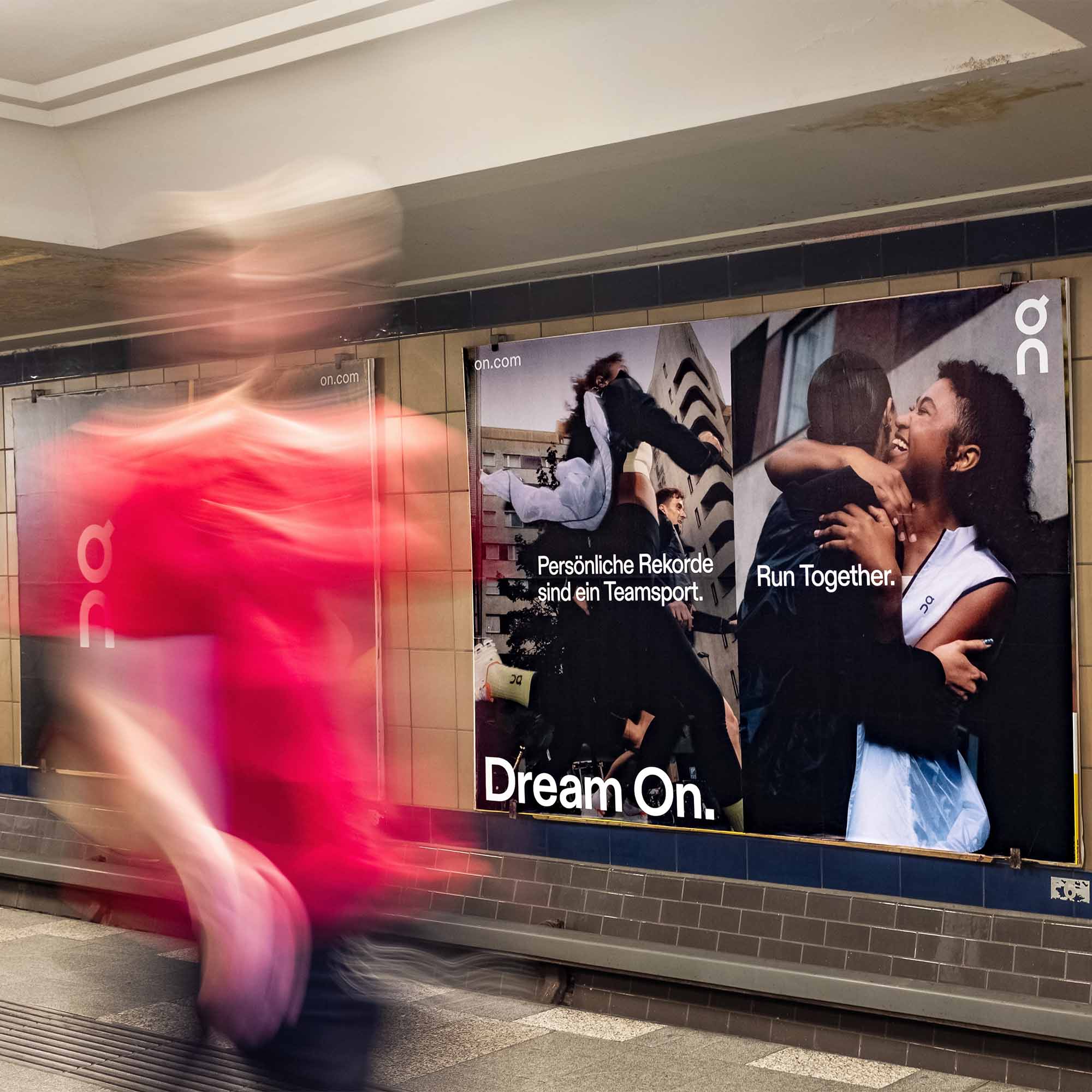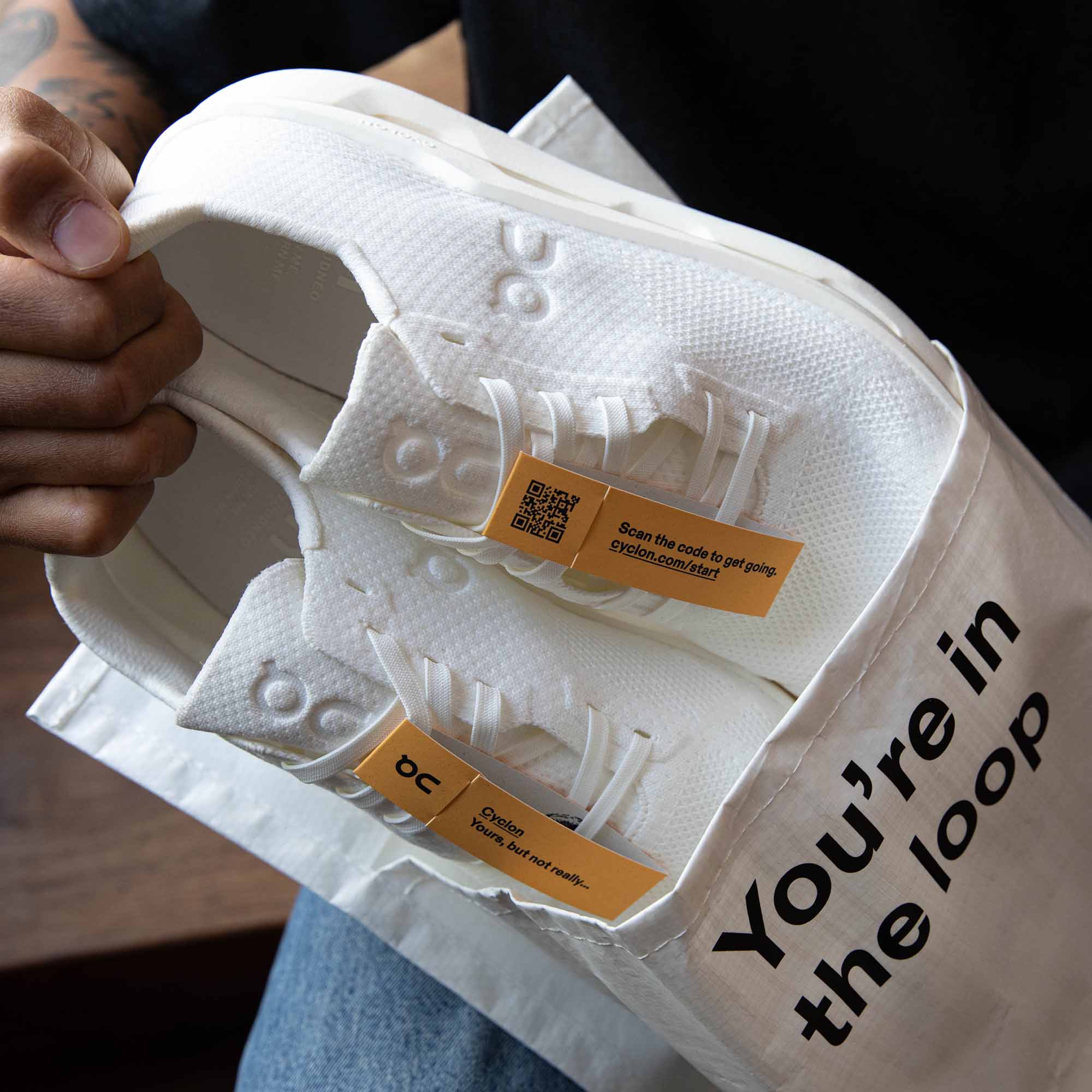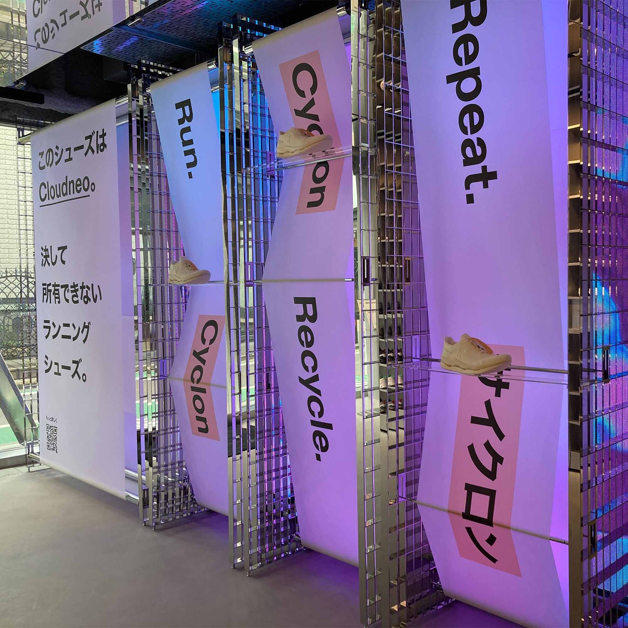 Graphic identity for the first running shoe based on a circular subscription model. The graphics embody the concept of continuous evolution through a live text edit style that includes typing, highlights, underlines, and strikethroughs, reflecting the ongoing nature of the subscription model.