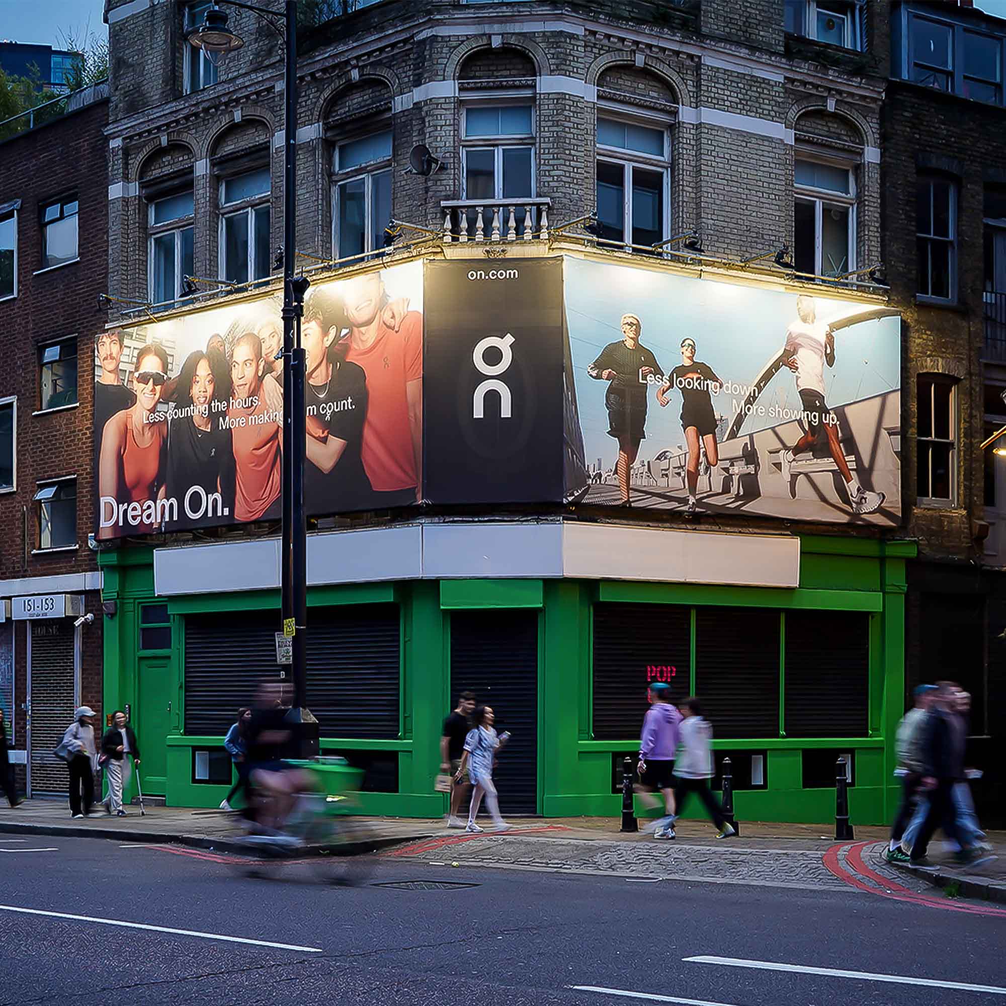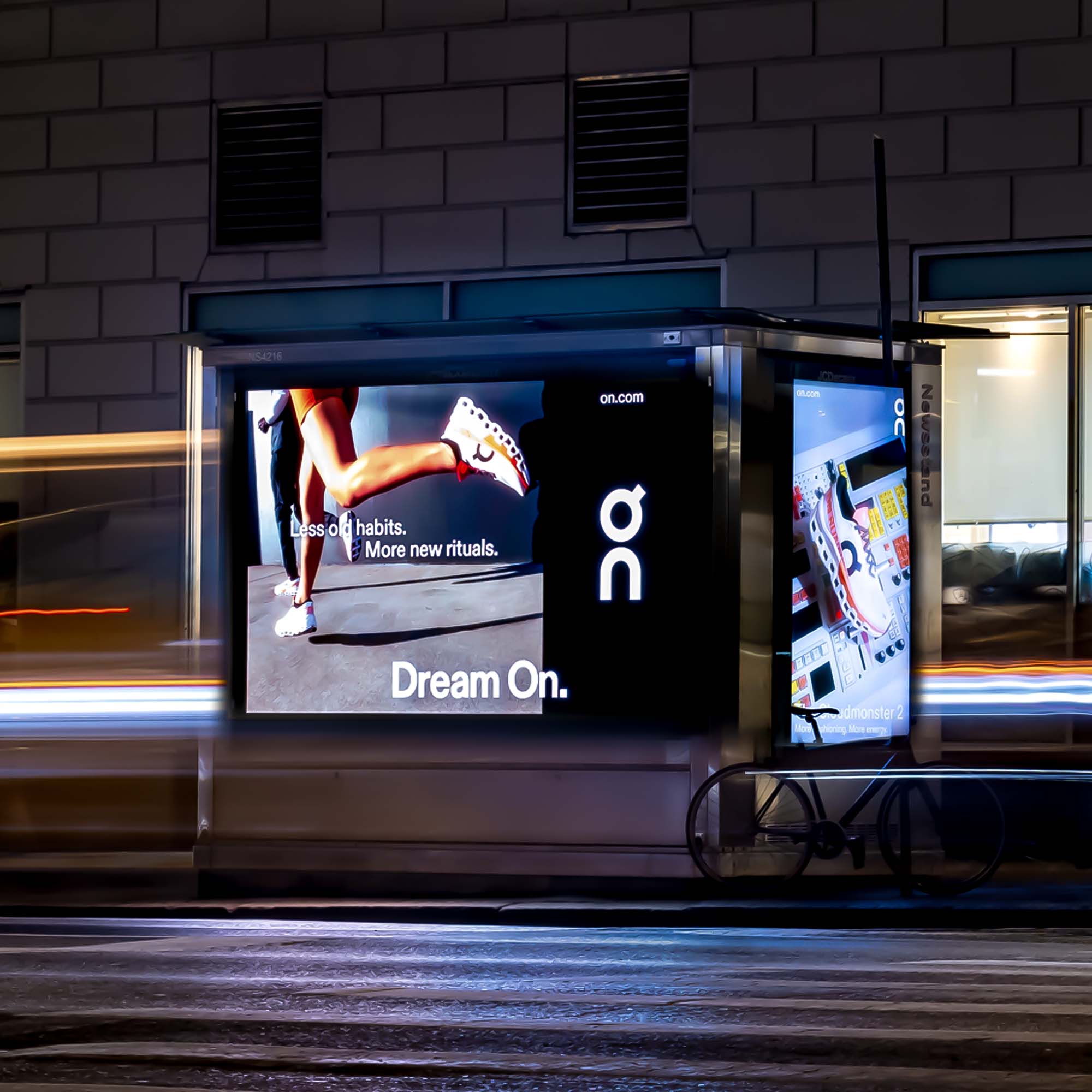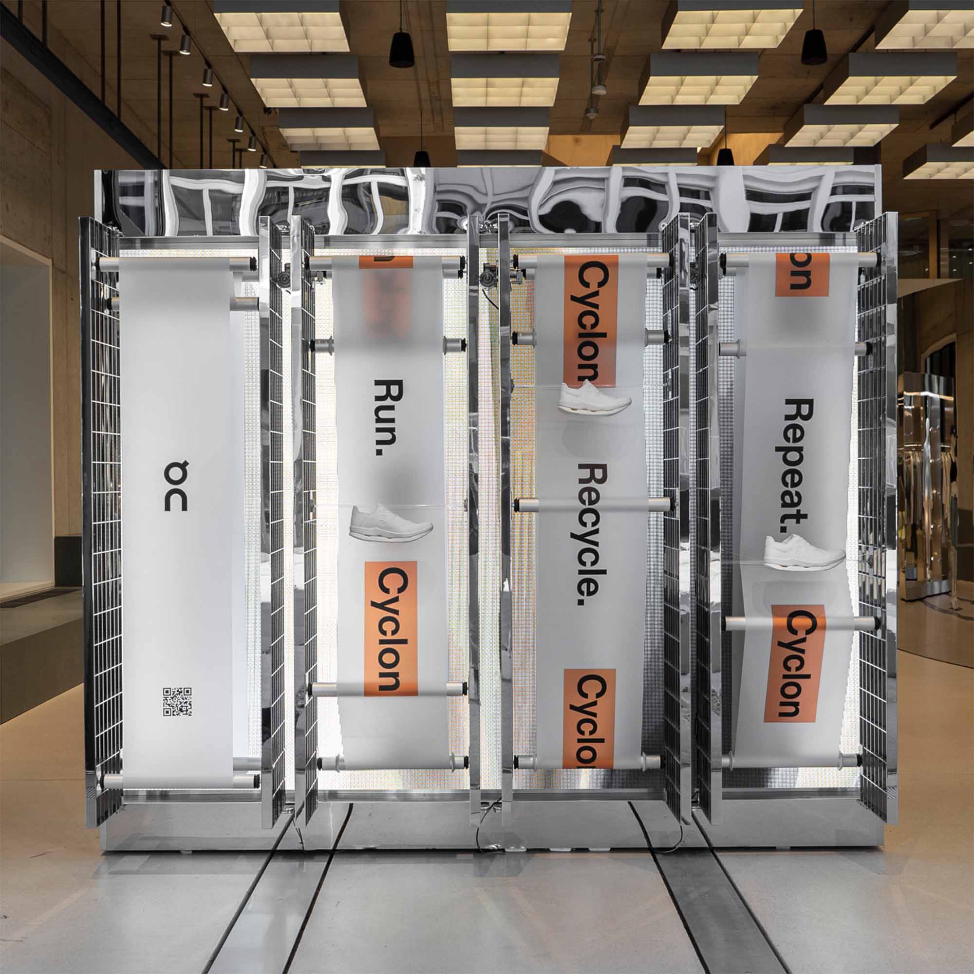 Graphic identity for the first running shoe based on a circular subscription model. The graphics embody the concept of continuous evolution through a live text edit style that includes typing, highlights, underlines, and strikethroughs, reflecting the ongoing nature of the subscription model.